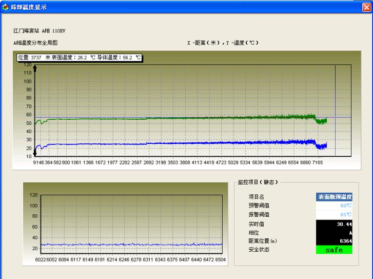 Ampacity電力電纜載流量分析軟件系統(tǒng)實(shí)時與FET8608L分布式光纖溫度監(jiān)測系統(tǒng)(簡稱:DTS)連接,獲取溫度數(shù)據(jù),并與其他廠家設(shè)備互聯(lián)互通。發(fā)現(xiàn)異常情況則向報警設(shè)備發(fā)送報警指令(根據(jù)用戶需要將報警信息發(fā)送給指定用戶)。Ampacity電力電纜載流量分析軟件系統(tǒng)局部界面集成了整條電纜表面溫度曲線顯示,Ampacity基于IEC60287標(biāo)準(zhǔn)實(shí)現(xiàn)動態(tài)載流量計算,可以準(zhǔn)確實(shí)時計算出監(jiān)控區(qū)域內(nèi)所有回路的電纜導(dǎo)體溫度和短時許用電流,提供完整的電纜負(fù)荷安全監(jiān)控的解決方案。